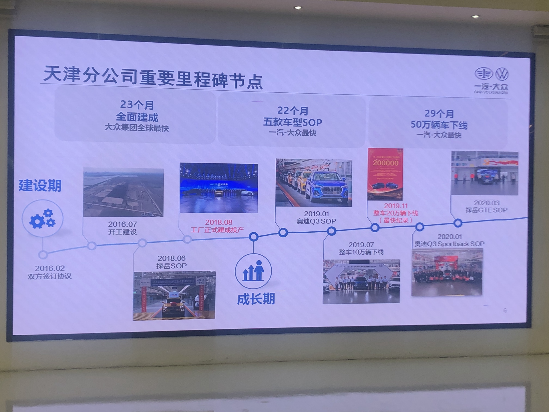 据了解,一汽-大众华北基地2016年7月开工建设,2018年8月正式建成投产,全面建成仅用时23个月,创造大众集团全球最快建成投产记录。聚力2019年,面对两款批量产品与三款新项目并行的局面,华北基地顶住压力,创造一汽-大众外部生产基地20万整车最快下线记录;创变2020年,仅用时22个月实现五款车型密集投产,仅用时29个月创造一汽-大众外部生产基地50万整车最快下线记录。启新2021年,突破疫情、限电、资源供应等瓶颈,华北基地保供稳产,以95分的成绩刷新了大众集团VDA6.3物流过程全球记录;众志2022年,华北基地又迎难而上,率先实现全面复工复产并支援供应商产能目标达成;笃行2023年,作为一汽-大众中高端SUV生产基地,华北基地实现了生产整车100万辆的历史性跨越……