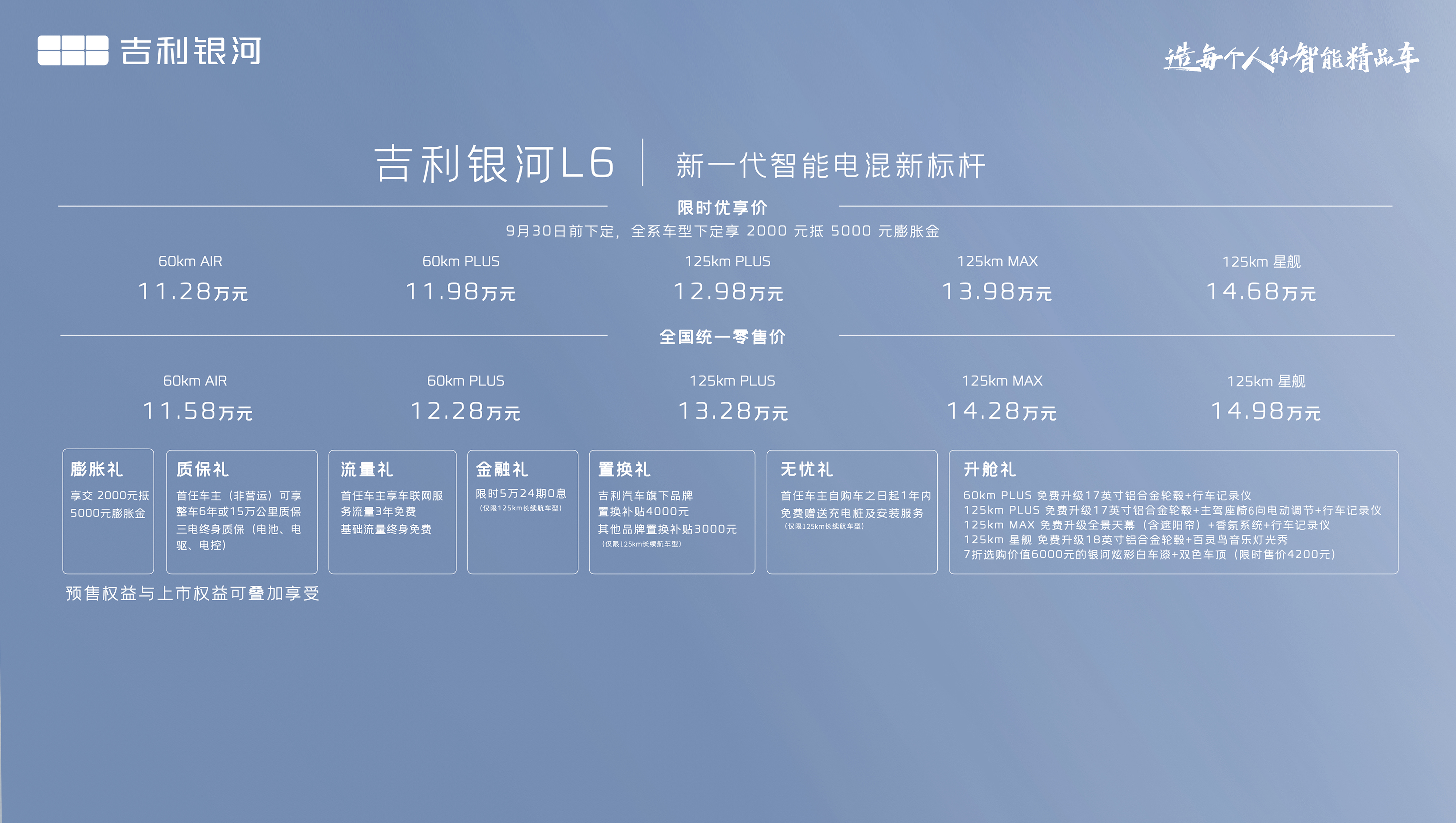 9月16日,吉利银河L6正式上市,推出60km纯电续航AIR版型、PLUS版型和125km纯电续航PLUS版型、MAX版型及星舰版型共五款车型,全国统一零售价为11.58~14.98万元,还将享受七重购车好礼。作为吉利践行“造每个人的智能精品车”理念的重磅战略车型,吉利银河L6标配四大“第一”: