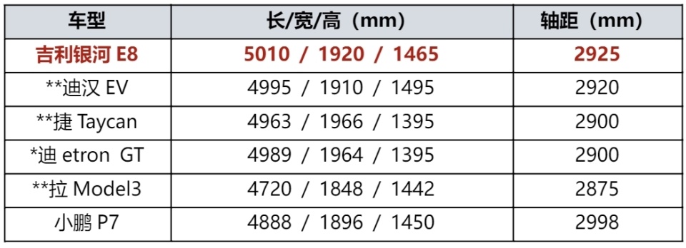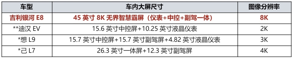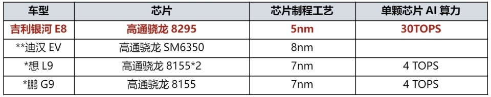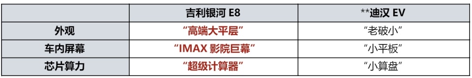 与**迪汉EV等老气横秋的“老破小”外观相比,科技新潮的吉利银河E8堪称“高端大平层”;与**迪汉EV车内2块“小平板”相比,拥有45英寸8寸的吉利银河E8堪称“IMAX影院巨幕”;与**迪汉EV搭载的高通SM6350芯片“小算盘”相比,拥有行业顶流高通骁龙8295芯片的吉利银河E8堪称“超级计算器”。