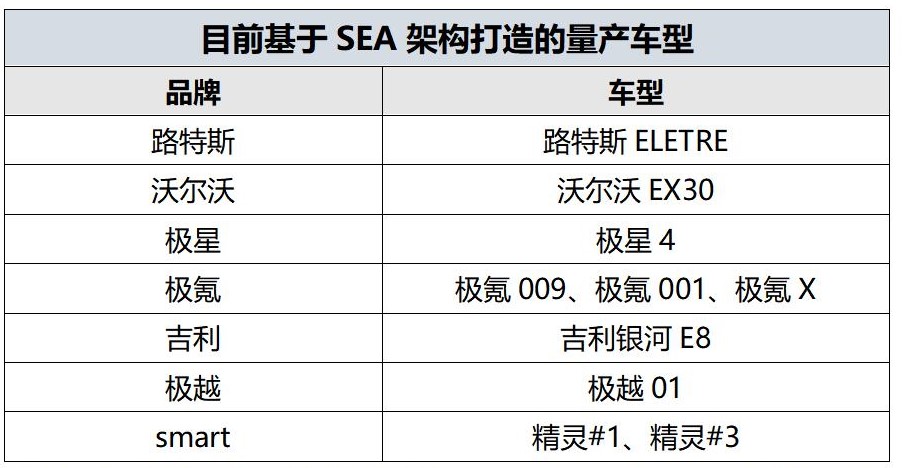 SEA架构下已经诞生了10余款高性能、豪华与高端纯电车型,吉利银河E8与百万级豪华纯电车型同源,都基于SEA架构打造。SEA架构是全球最强的智能纯电架构,拥有全球最大带宽,实现了从A级车到E级车的全尺寸覆盖,可以满足轿车、SUV、MPV、小型城市车、跑车、皮卡及未来出行车辆等全部造型需求。SEA架构也是全球最高效的智能电动汽车解决方案,软件开发效率提升50%,零部件通用率高达76%。