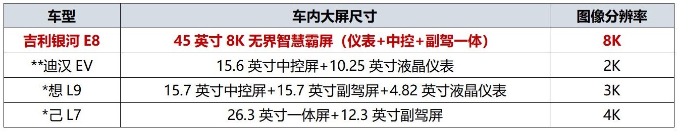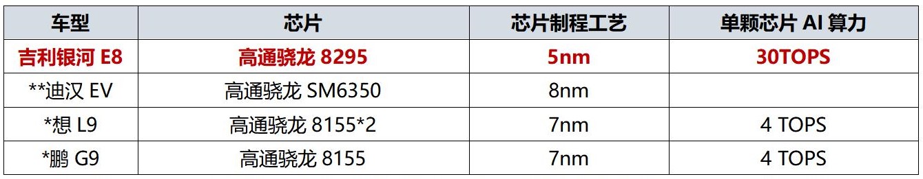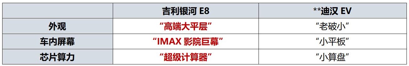 与**迪汉EV等老气横秋的“老破小”外观相比,科技新潮的吉利银河E8堪称“高端大平层”;与**迪汉EV车内2块“小平板”相比,拥有45英寸8寸的吉利银河E8堪称“IMAX影院巨幕”;与**迪汉EV搭载的高通SM6350芯片“小算盘”相比,拥有行业顶流高通骁龙8295芯片的吉利银河E8堪称“超级计算器”。