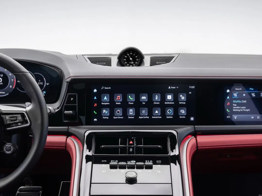 就是车内屏幕的变化,整个中控台横向分布了三块屏幕,仪表盘的UI还是最为经典的五连仪表盘,还增加了了副驾驶的娱乐屏,具备防窥视功能,不过是要选装的,整套车机由保时捷中国团队开发,进行了深度本土化优化,可以适配大部分常见的APP。