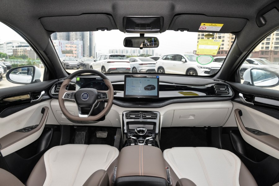 内饰方面,比亚迪秦PLUS整体层次感比较强,中控台上部用到了软性材质,中间位置有高亮黑色饰板搭配,再往下还有木纹贴片。像空调出风口,方向盘和车门拉手也用到了金属风格装饰。中控大屏尺寸有两种规格,120KM 超越型/120KM 卓越型采用了12.8英寸中控大屏,其余版本都是10.1英寸。车机搭载DiLink智能网联系统,支持4G网联,蓝牙,导航,主驾驶语音控制等功能。两种尺寸中控大屏都支持自适应旋转功能。秦PLUS DM-i这套车机逻辑比较简洁,操作容易上手。实际体验下来,感觉比较好的一点是车机应用比较丰富,常用的影音或者聊天软件都可以在应用中心下载,和安卓生态的匹配度很高。语音方面,只支持主驾驶语音控制,可以通过语音控制空调,多媒体,电话,天窗等功能,对于一些简单的指令的识别准确率比较高,在驾车过程中使用语音控制能在一定程度上让驾驶更专注。