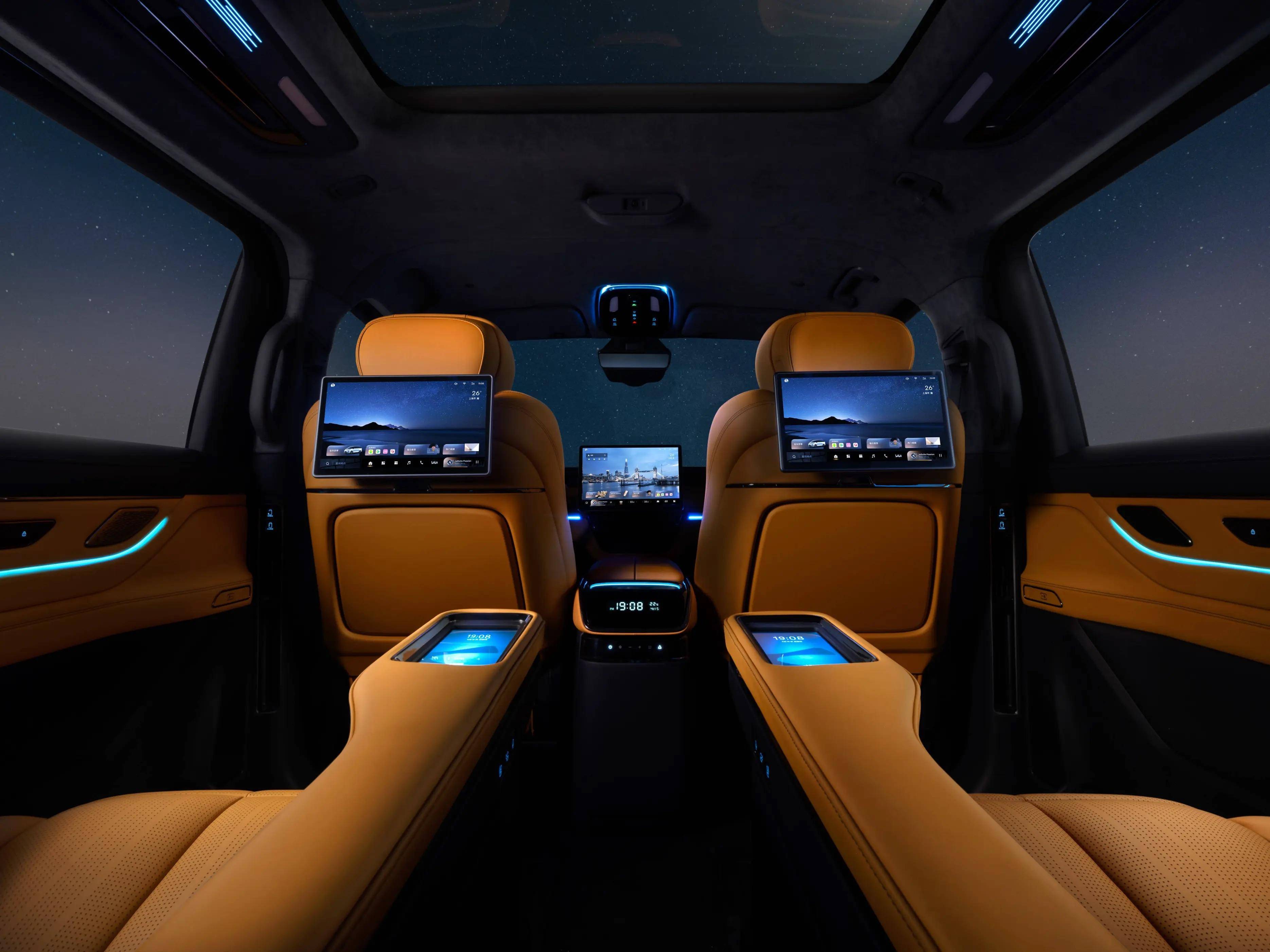 L380基于SOA(Space Oriented Architecture)空间导向型架构打造,实现了纯电架构下舱内地板的平整化。内舱长度达到了3974mm,中央通道宽度为200mm。乘员舱还配备了前后贯通长达1.9米的一体式无极滑轨,座椅布局灵活多变。第三排乘客可以享受独立座椅并支持半躺状态,非常适合长途出行。