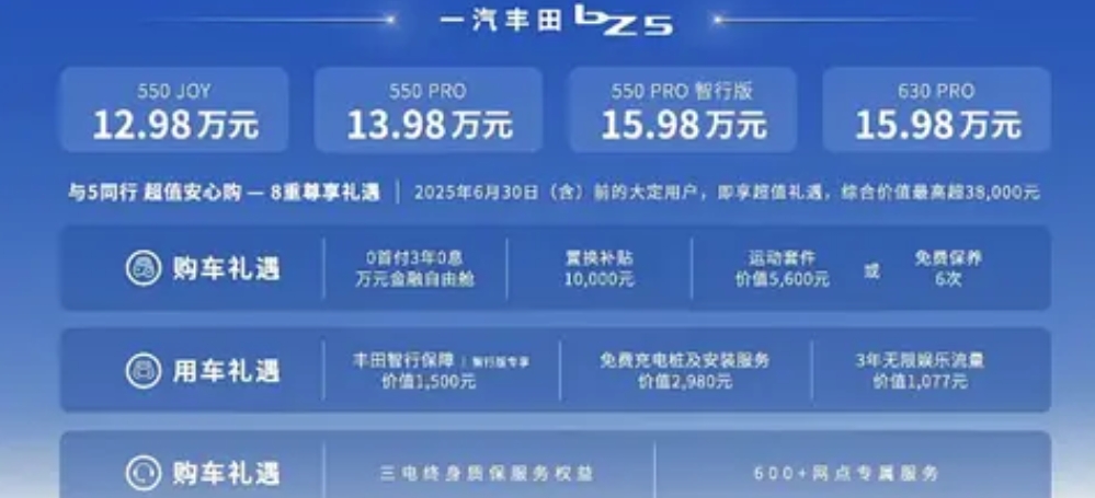新能源市场竞争的“下半场”,合资品牌开始逐渐发力,6月10日,一汽丰田旗下第三款纯电车型——一汽丰田bz3正式上市,新车共推出4款配置车型,指导价区间12.98万元-15.98万元。