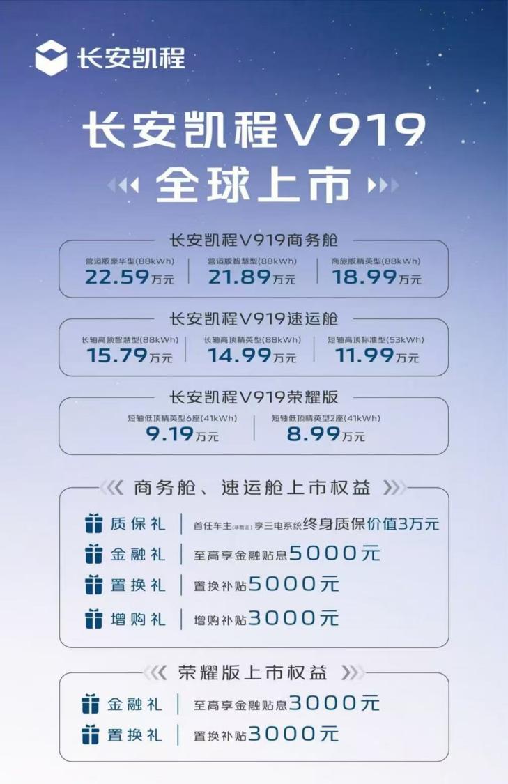 此次上市发布会新车推出了商务舱、速运舱、荣耀版等多个车型,官方售价8.99万-22.59万元,同时公布了不同车型的上市权益。