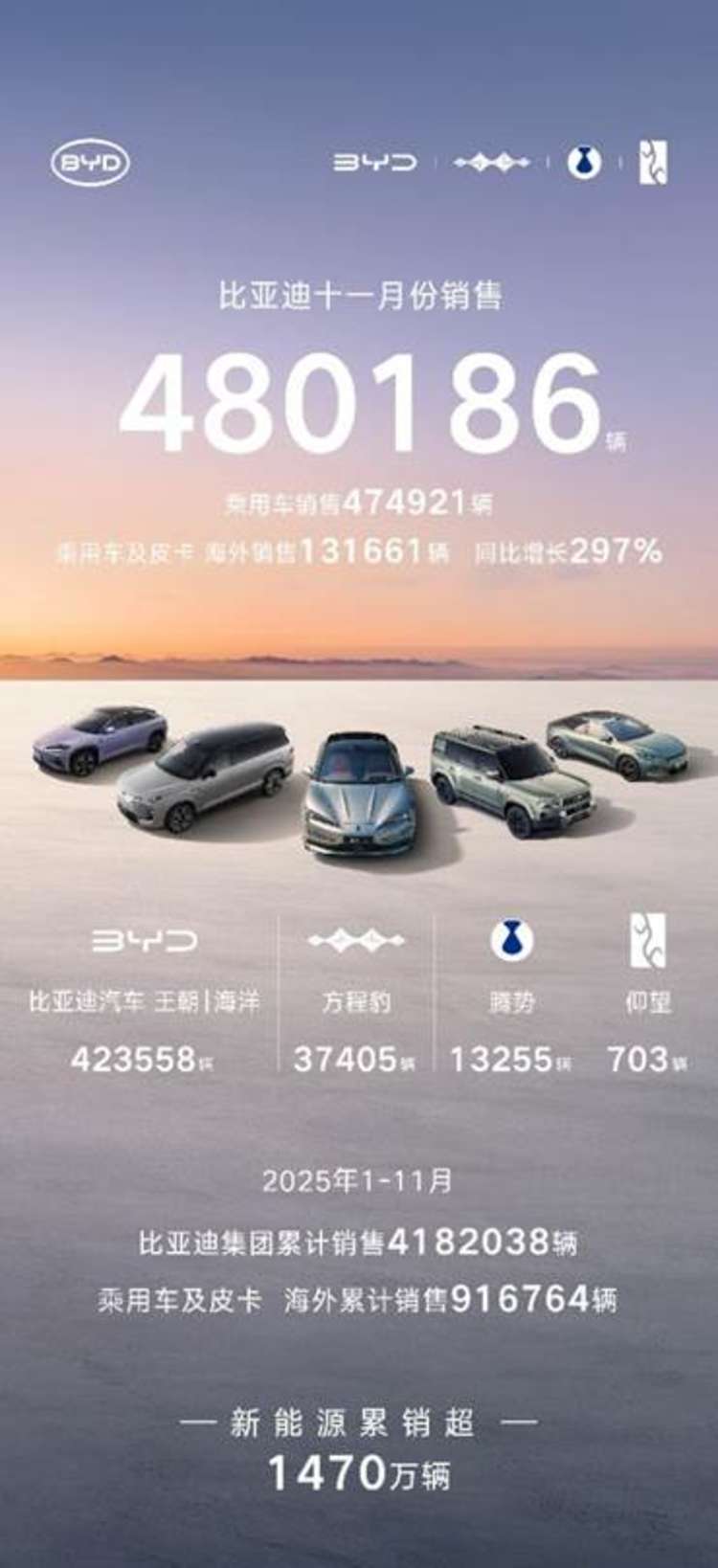 2025年11月,比亚迪销售超48万辆,其中海外销售突破13万辆,双双创年内新高。2025年1-11月,比亚迪累计销售已超418万辆,持续领跑全球新能源汽车市场,完成全年460万销量目标也是板上钉钉的事了。如果你以为比亚迪只是车卖的好,那你就错了!比亚迪不只是新能源汽车销量的引领者,更是新能源汽车技术的引领者。有位网友说:在新能源汽车这个全新的领域,比亚迪一直在摸着石头过河,而友商一直在摸着比亚迪过河。你知道的很多新能源汽车技术,可能都是由比亚迪首创的,然后其他友商跟进,慢慢成为了新能源汽车的标配。早在2011年,比亚迪就推出了车辆远程控制(云服务)功能,可以通过手机远程解锁和锁闭车门,也可以