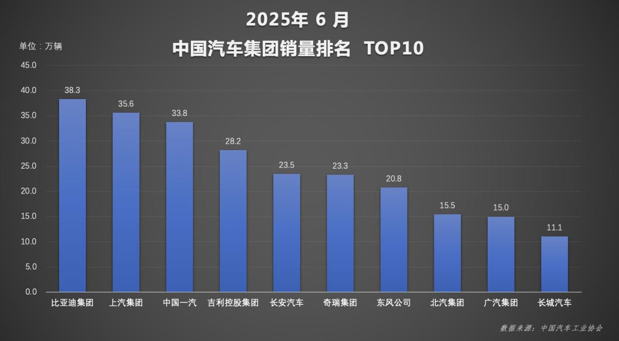 2025年6月,中国汽车市场格局持续刷新。无论在集团销量TOP10还是品牌销量TOP10中,自主品牌表现都很优秀,占据半边江山之多。比亚迪表现亮眼,不仅以38.3万辆的集团销量蝉联榜首,其单一品牌销量更以34.3万辆的绝对优势领跑全市场,领先优势显著。