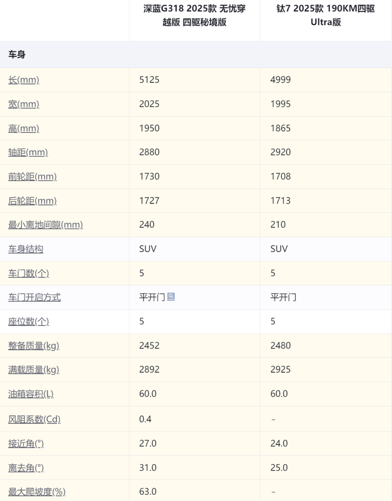 钛7是基于唐L(参数|询价)所打造的方盒子SUV,所以在很多尺寸方面和他的大哥是一样的,长度4999毫米,宽度1995毫米,高度1865毫米,轴距2920毫米,还有一个小书包,已经是一个非常不错的水平了。但是深蓝G318四驱秘境版长宽高全部都大于钛7,尤其是长度,一口气达到了5125毫米这个偏大的中大型SUV尺寸,除了轴距稍短之外,它的宽度和高度水平也都要超过钛7,前后轮距数据也要更大一些,行驶稳定性更好。另外离地间隙方面,偏向于越野的深蓝G318达到了240毫米,更对得起越野车的身份,钛7为210毫米,没有和主流的城市SUV拉开大的差距。