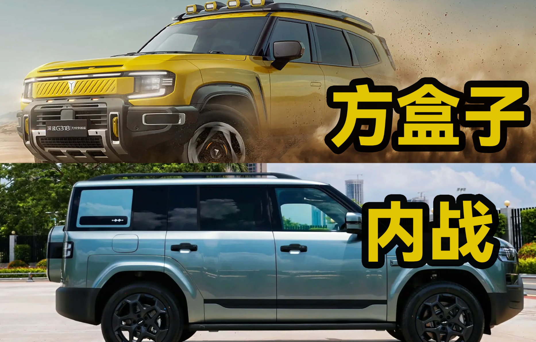屏幕前帅气的你最近财运亨通,卡上多了20万,你灵机一动,想买一辆SUV,那么你身边的很多人可能都会劝你去买大而全的选择,也就是什么方面都要照顾到位,什么大6座,什么全家吃火锅。但依旧有一些掌握真理的少数人,不愿去随波逐流,而是赋予车辆更多的情感和寄托,他们的推荐更简单,越来越流行的方盒子车。于是问题就来了,市场上热度很高的这2款方盒子车,深蓝G318(参数|询价)无忧穿越版四驱秘境版和方程豹钛7(参数|询价),到底该选哪样呢?