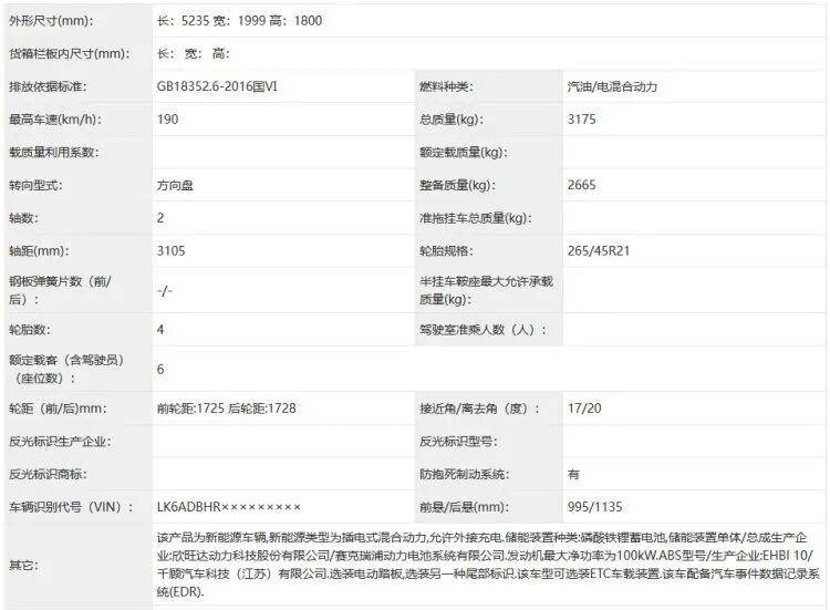新车长宽高分别为5235/1999/1800mm,轴距3105mm,尺寸来说和大家熟悉的理想L9身材非常接近。从申报信息来看,该车会配备21寸轮毂,采用6座布局,整备质量2665kg,总质量3175kg。
