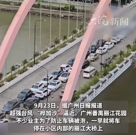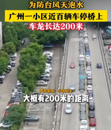 对于没有地库的车主来说,把车停在地势较高的地方是为数不多的选择。广州一小区近百辆车停在了附近的桥上,队伍长达200米,也算是吸取了当年郑州暴雨的经验。