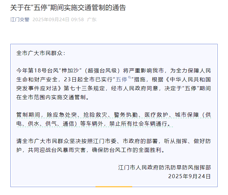 广东江门作为核心受灾区,交通运输局采取了紧急管制,发布《关于在“五停”期间实施交通管制的通告》,在此期间,全市交通信号灯为红灯,禁止社会车辆通行。除了江门之外,不少城市实行了“五停”。
