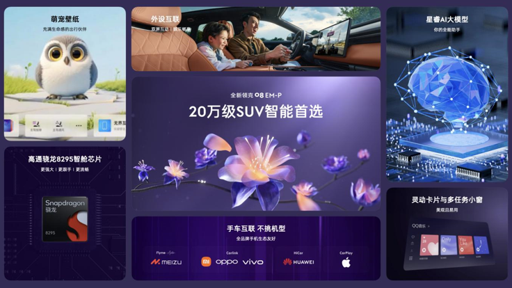 此外,LYNK Flyme Auto 2座舱系统全面接入星睿智算中心2.0云计算平台,星睿AI大模型、阶跃多模态模型组成的超强AI Agent,化身随行AI智能管家,可提供行程助手、百科全书、儿童模式等丰富专属AI功能,让全家在出行中,大人不无聊、孩子不吵闹。