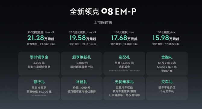 9月24日,全新领克08 EM-P 低价上市,仅15.98万元起。此前,领克汽车对外官宣:全新领克08EM-P是20万级SUV首选,等到价格尘埃落定之时,已然成为16万级SUV首选。作为全系标配激光雷达的SUV,领克08EM-P的产品力超过了市面上很多30万级的SUV。