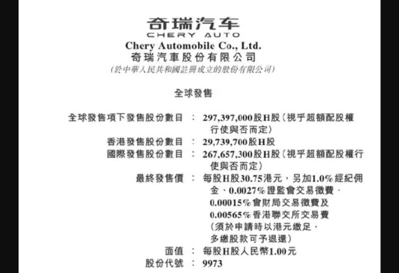 据统计,上市首日,奇瑞汽车以30.75港元/股的招股价上限定价,募资规模达91.4亿港元,目前总市值为1892亿元,与吉利持平。