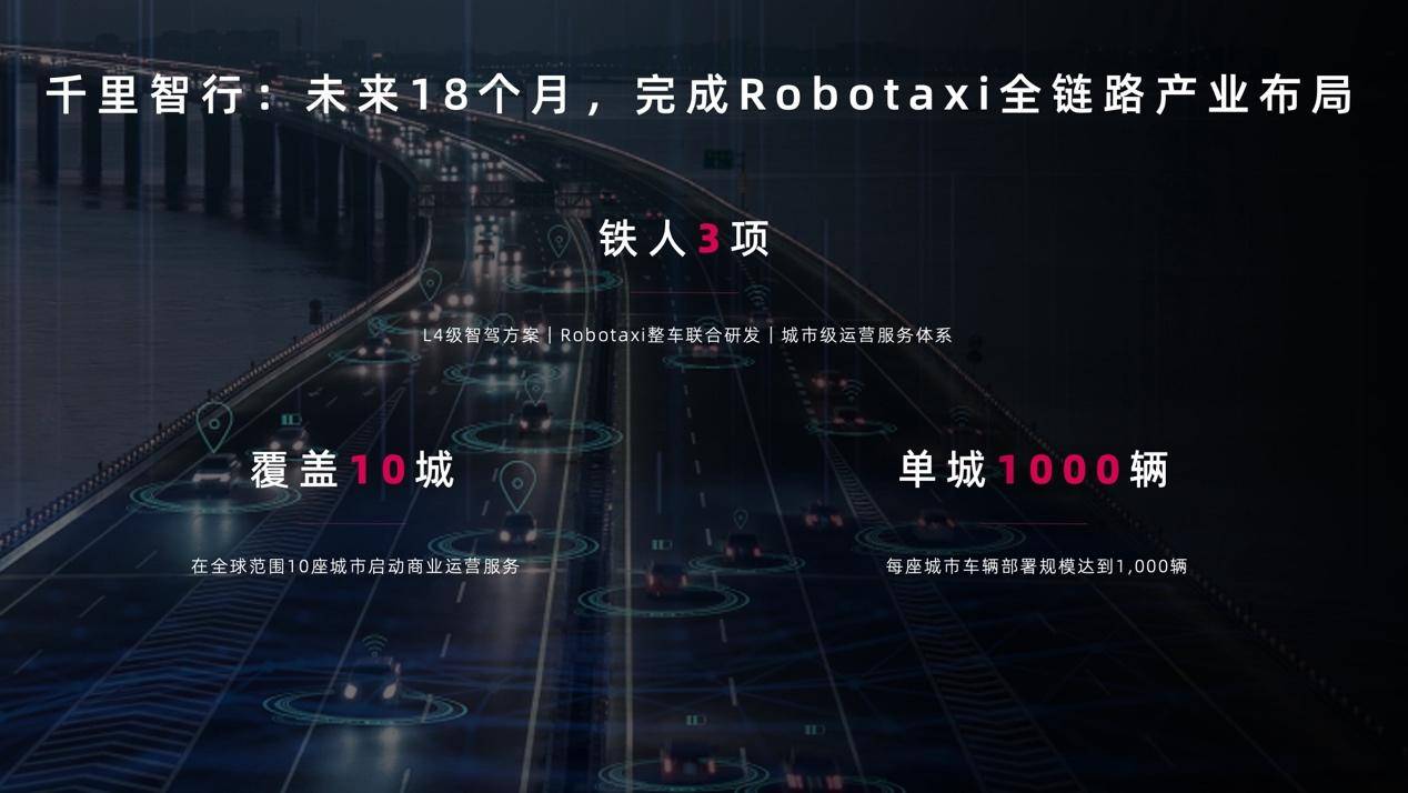 在智能出行领域,随着技术迭代、成本下探和政策开放,预计Robotaxi在未来三年进入快速普及期。目前,千里科技已制定相应计划,目标在未来18个月完成Robotaxi全链路产业布局。首先,通过推动产业整合,构建从技术、产品到服务的完整产业体系。目前,千里科技正在加速L4级智驾方案的研发,与吉利合作研发Robotaxi专用车型,并与国内外领先的出行服务提供商合作,共同打造Robotaxi运营服务平台。根据计划,千里科技将携手合作伙伴,在全球10座城市实现规模化的Robotaxi运营服务,在单一城市部署超过1000辆Robotaxi,跨越商业化门槛,赢取行业入场券。