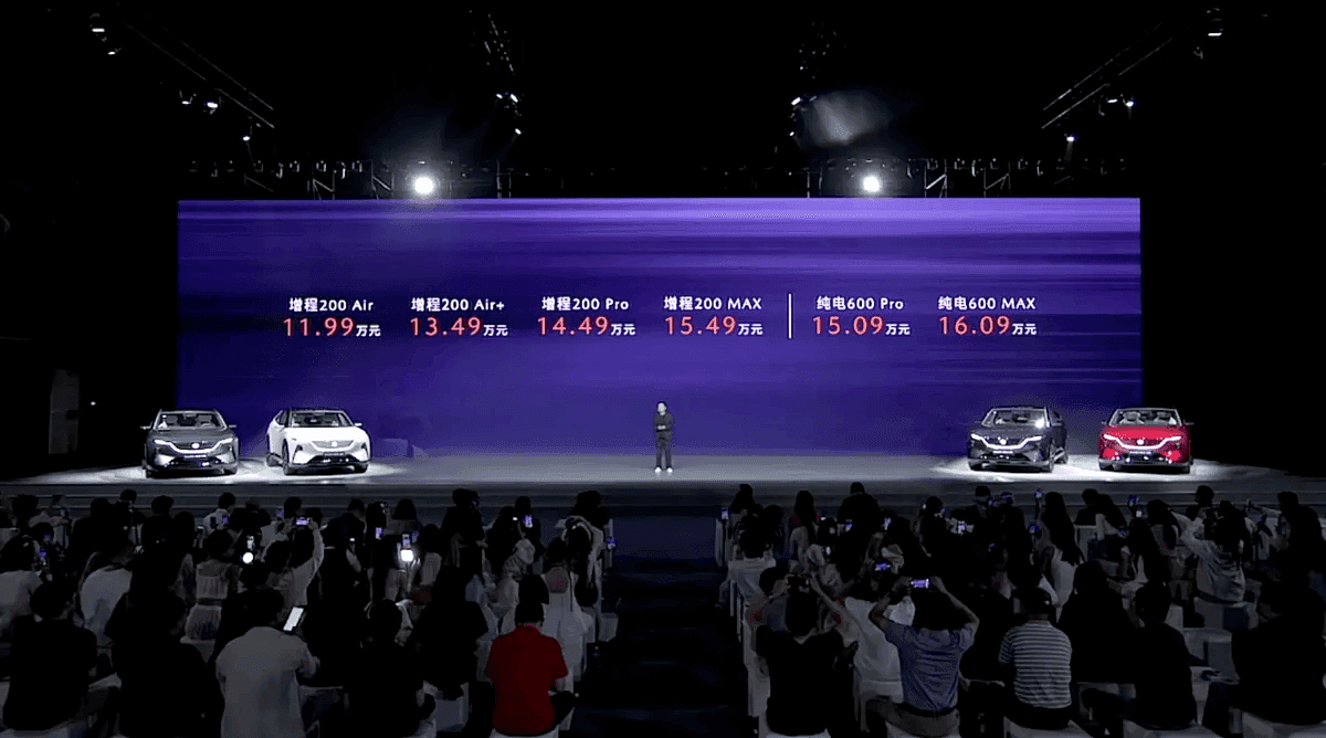 在此之前我们先看基本的参数,先说动力,增程版搭载的是1.5L发动机作为增程器,最大功率72kW,采用的后置电机,电机最大功率为190kW,电池容量为17.5kWh,CLTC纯电续航200km,电池是来自时代长安的磷酸铁锂;纯电版也是后置电机,电机最大功率为190kW,CLTC续航600km,电池来自中创新航的磷酸铁锂。悬架均为前麦弗逊独立+后H臂多连杆式独立悬架的组合。