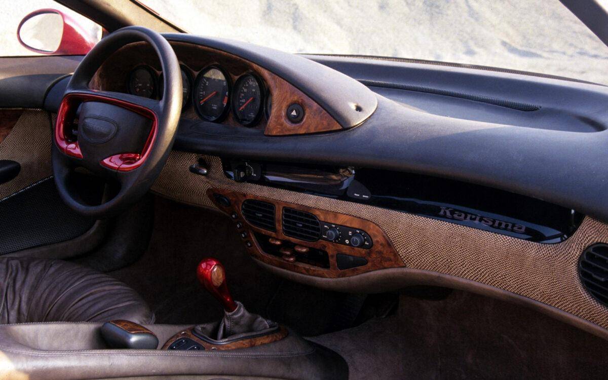 内饰方面,Karisma展现了典型的GT轿车风格,大量使用树瘤木饰板,保时捷仪表盘嵌入木质装饰框中,座椅采用当时流行的宽松皮革风格,表面处理呈深棕色响尾蛇皮纹理。车辆保留了后置发动机布局,博通用钛色调的发动机盖彰显这一设计特点,盖板上标注着"powered by porsche"字样,并设有进出气口。