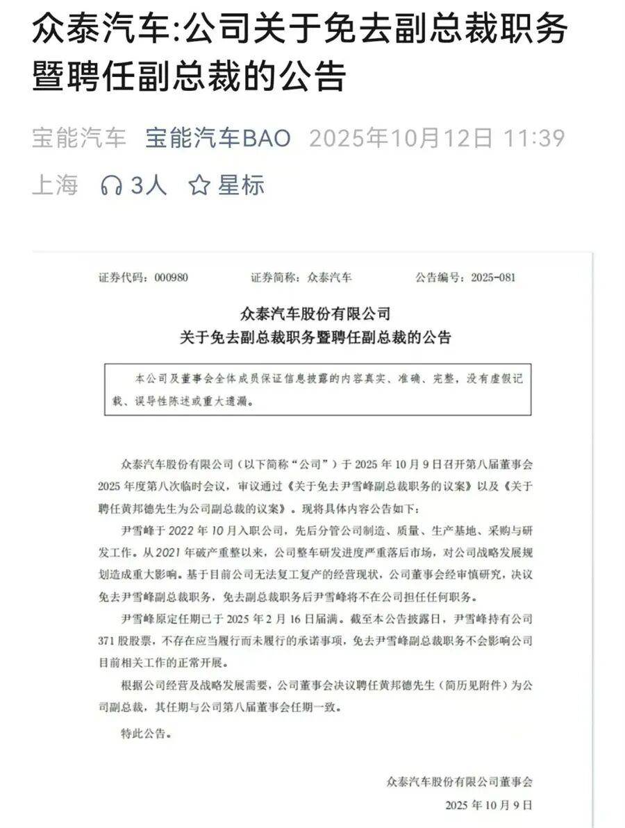 10月9日,众泰汽车发布重要人事变动公告,免去尹雪峰副总裁职务。公告中这句话,似乎也饱含深意——