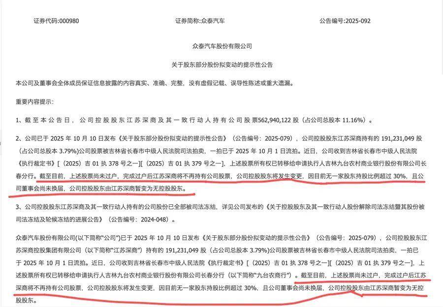 10月15日晚,众泰汽车发布“关于股东部分股份拟变动的提示性公告”。据公告内容,众泰汽车控股股东江苏深商持有的1.91亿股(占公司总股本3.79%)公司股票被吉林省长春市中级人民法院司法拍卖,一拍已于2025年10月1日流拍。