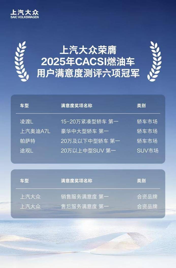 上汽大众荣膺2025年CACSI燃油车用户满意度测评六项冠军