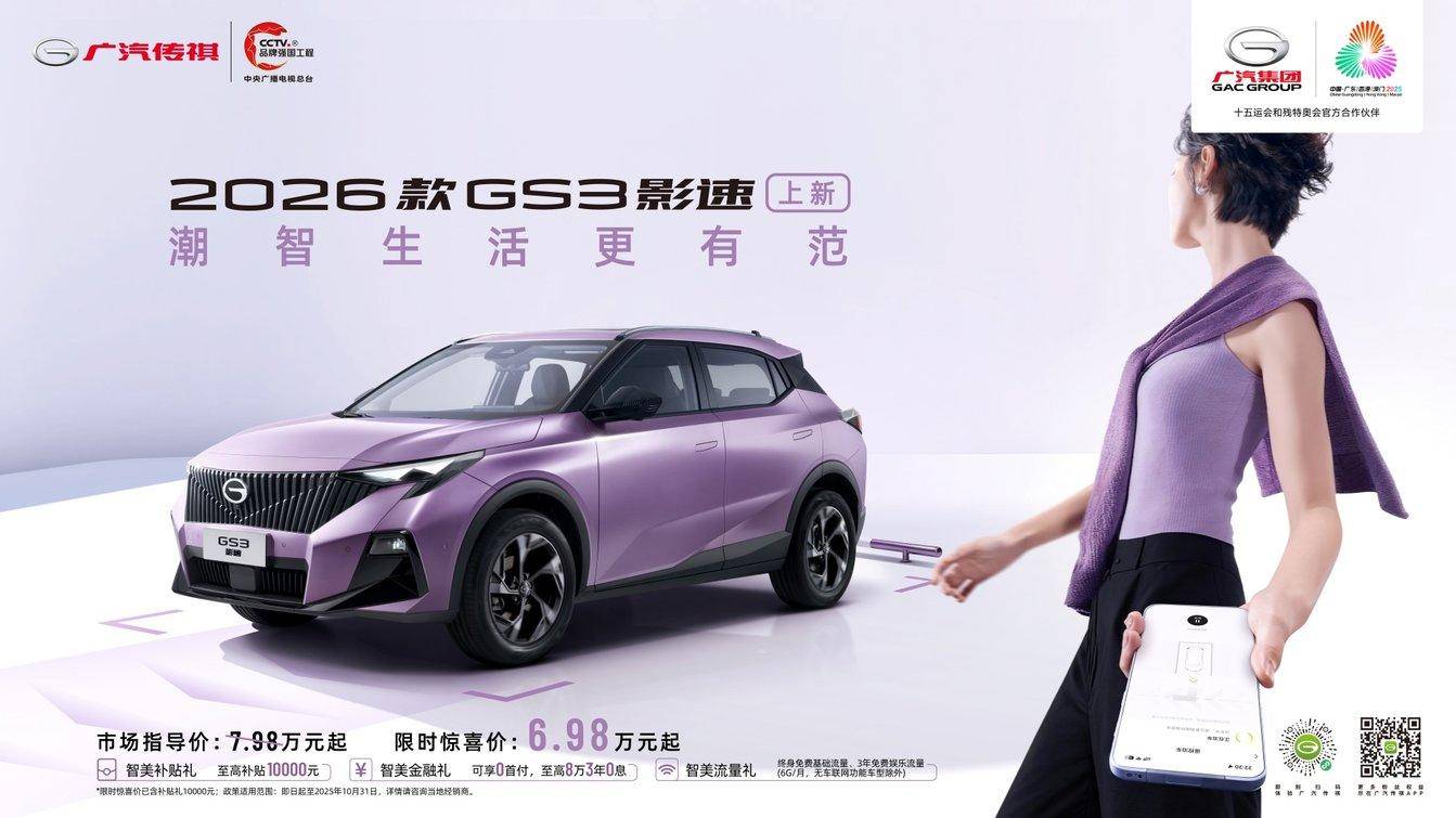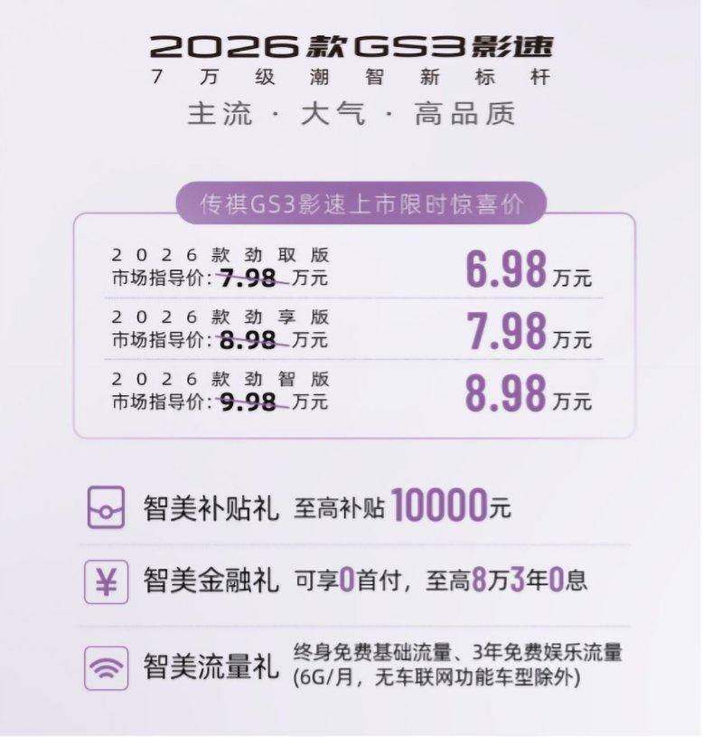 10月27日,7万级潮智新标杆2026款传祺GS3(参数|询价)影速正式上市!新车共推出3个版本,官方指导价为7.98~ 9.98万元,限时惊喜价6.98万元起,可叠加至高8万3年0息金融政策,用户可以轻松上车。