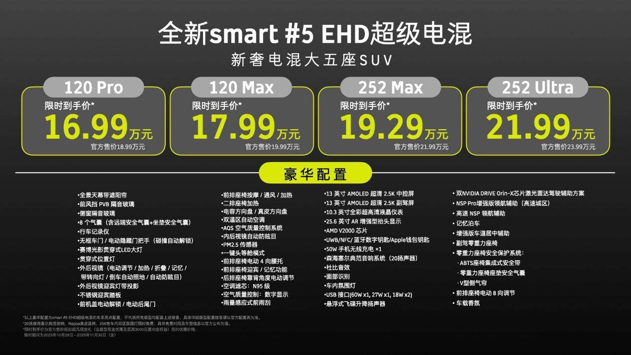 smart #5 EHD超级电混,共推出4个版型,全系标配120多项豪华配置:超级电混 120 Pro,入门即顶配,轻松应对城市日常;超级电混 120 Max,豪华进阶不焦虑,豪华插混品质之选;超级电混 252 Max,里程进阶新远方,长途旅行说走就走;超级电混 252 Ultra,豪华智能一步到位,体验更全面。