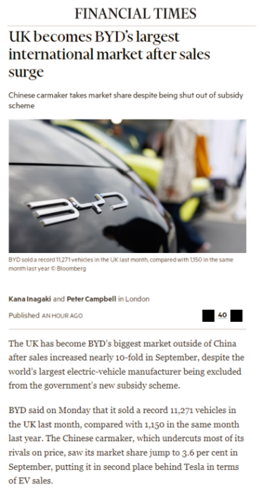 图2:英国广播公司(BBC):中国电动汽车巨头比亚迪在英国销量激增880%图3:《泰晤士报》:中国新晋品牌比亚迪超越英国老牌汽车品牌图4:《金融时报》:英国销量飙升,成为比亚迪最大的国际市场
