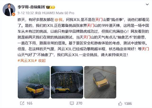 天门山“上天梯”以150米垂直落差、平均45°坡度(局部超60°)及30厘米宽湿滑台阶闻名,曾被业界视为“量产车禁区”。2018年,华裔F1车手董荷斌驾驶路虎揽胜运动版P400e插电混动SUV成功登顶,成为首款完成挑战的量产车型。此次奇瑞风云X3L的挑战,被外界解读为国产车向国际豪华品牌技术标杆发起冲击的信号。