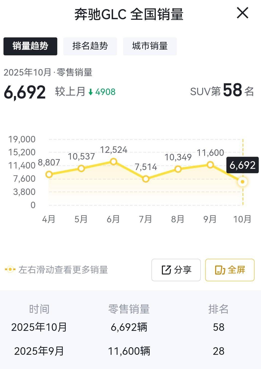 在10月的豪华SUV销量榜中,问界M8以17484辆新车的销量数据夺得榜首,超越了传统豪华车型。相比之下,奔驰GLC在10月的销量却仅为6692辆,排名甚至还不如老迈的奥迪Q5L高,也与其在9月的表现形成鲜明对比。