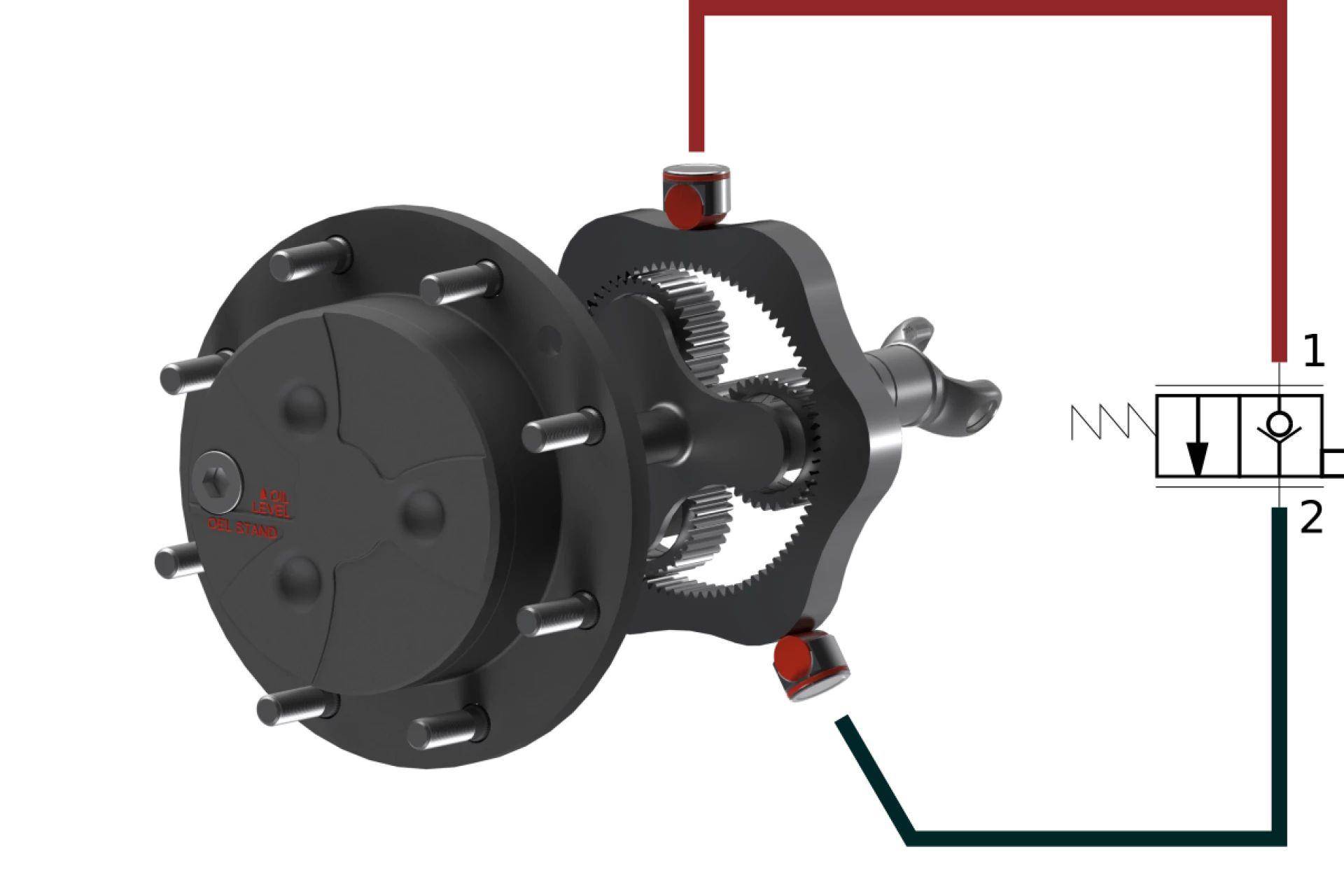 目前 Line Traction 系统已优化适配四驱农业机械,可应对极陡坡、极端崎岖或泥泞路面。在展会上,它成功驱动了瑞士品牌 Aebi 打造的原型拖拉机。该系统摒弃了传统差速器,在每个车轮处配备一组行星齿轮。发动机输出轴带动行星齿轮,进而驱动内齿式外齿圈。齿圈与轮毂相连,最终带动车轮转动。系统最具创新性的设计,是齿圈与轮毂的连接方式:通过液压回路实现连接。液压回路可将齿圈固定,也可允许其旋转,且旋转速度可精确控制。齿圈旋转时,车轮转速能低于驱动轴转速,同时保留全部驱动力。轮毂转速自动调节,无需驾驶员额外操作。
