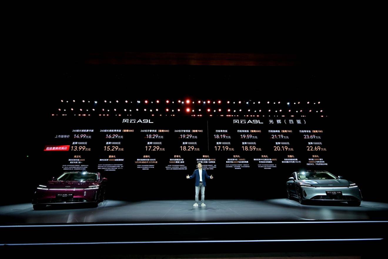 2025年11月15日,"进化"风云A9(参数|询价)L光辉(四驱)全球上市发布会在重庆广阳岛国际会议中心隆重举行,本次上市共推出四款版型,正式售价为17.19万元起,共推出四个版本车型,其中四驱尊贵版售价17.19万、四驱高能版(猎鹰(参数|询价)500)售价18.59万、四驱巅峰版(猎鹰700)售价20.19万、 四驱尊享版(猎鹰700)售价22.69万。并同步推出"九大购车权益",涵盖高定、置换、金融、舒享、尊驰、驭风、充电、流量、质保多重礼遇,为中国豪华汽车市场再次立下全新标杆。