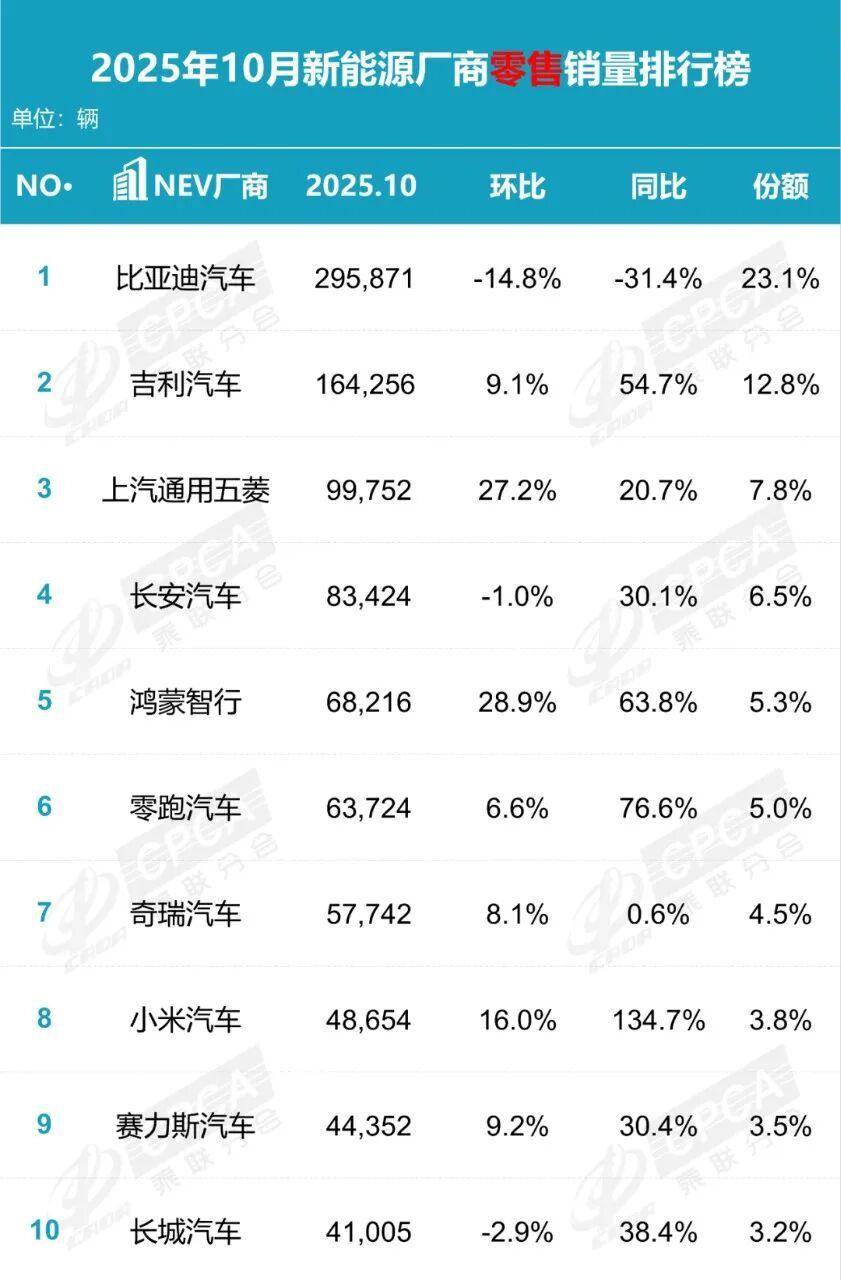 但是唯独排名第一的比亚迪销量下滑,虽然10月份达到了29.58万辆,但是销量环比下滑了14.8%,同比下滑了31.4%,而销量下滑的最直接原因也是同级别对手越来越强,10月份的吉利银河、长安启源、吉利品牌星系列都在发力,并且价格也都来到了10-15万区间。