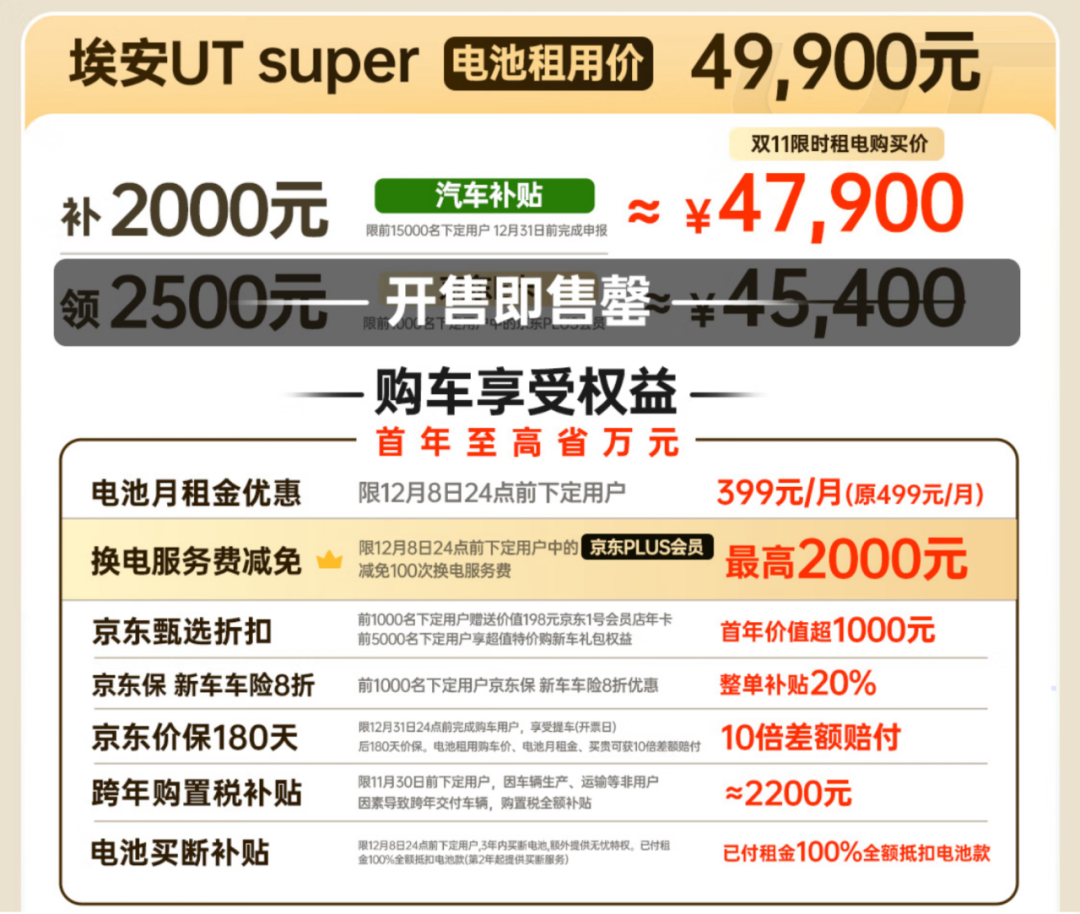 埃安与京东、宁德时代联合打造的纯电两厢车埃安UT Super于2025年11月9日上市,它基于埃安UT打造,支持了宁德时代的巧克力换电网络,并在京东商城上架销售。