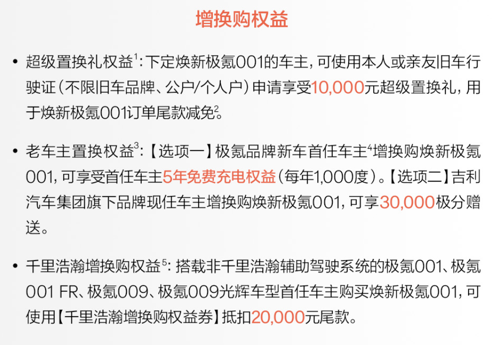 极氪则在原有置换补贴基础上,还为购买初代001的老车主提供了终身免费充电权益转移、整车终身质保权益转移等活动。