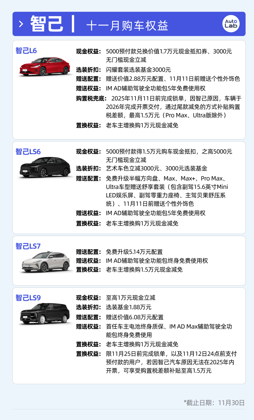 另外,智己也在双十一为LS6和L6提供了现金礼、赠送外饰色、购置税兜底等权益。