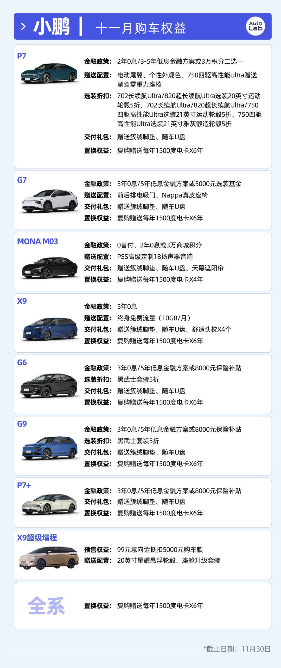 11月,小鹏对权益再次进行了加码,为P7和G7推出了免息/低息贷款或赠送积分等权益,并为复购老车主提供最长6年、每年1500度免费电卡的福利。