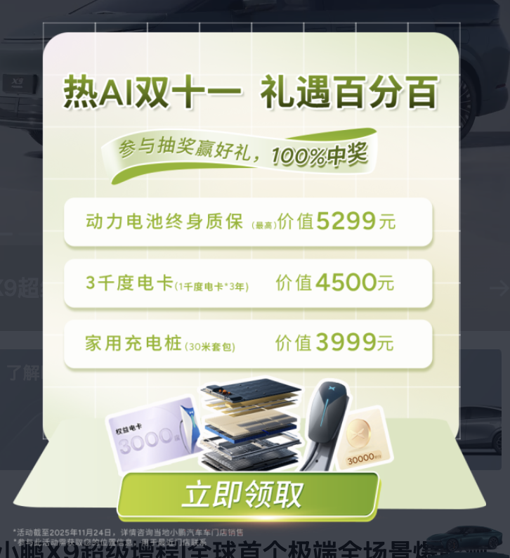 同时,小鹏也借着双十一在商城开启了抽奖活动,可抽取动力电池终身质保、3000度电卡、家充桩等权益,刺激潜在用户下单。