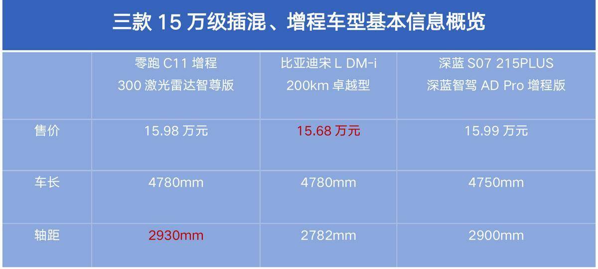 我们选取的三款车型,分别是售价15.98万元零跑C11增程300激光雷达智尊版、售价15.68万元的比亚迪宋L DM-i 200km卓越型和售价15.99万元的深蓝S07 215PLUS 深蓝智驾AD Pro增程版车型。这三款车型的价格差不了多少,尺寸也相近,销量也都很不错,基本上能够代表这个价位级别插混和增程SUV的整体能力。