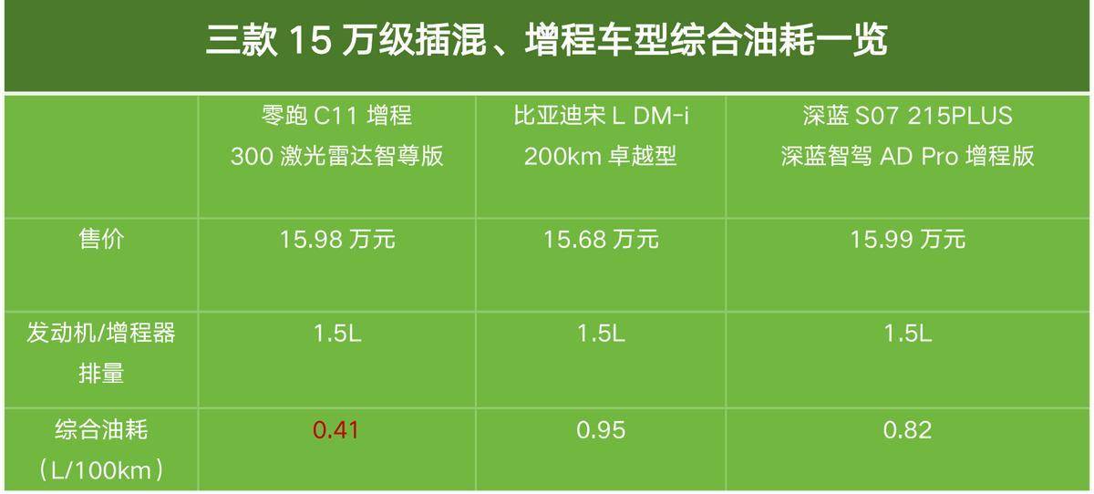 那么在这种情况下,车辆的综合油耗就显得非常重要了,而且电池越大的车型,综合油耗会越低,这一点大家也都能理解。我们也查询了这三款车型的综合油耗水平,零跑C11的综合油耗为0.41L/100km,比亚迪宋L DM-i的综合油耗为0.95L/100km,深蓝S07增程的综合油耗为0.82L。相对来说,零跑C11的综合油耗就是其他两款车的一半,但整体来说,这三款车型的综合油耗都很低。