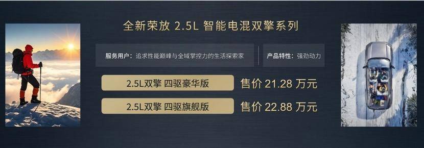 2.5L 智能电混双擎系列专为追求性能巅峰与全域掌控力的生活探索家而生,以强悍的2.5L大排量双擎动力为核心,搭配先进的E-Four电控四驱系统,用毫不妥协的巅峰性能与全面豪华的尊享体验,满足用户征服未知的雄心。全新荣放2.5L双擎四驱豪华版,售价为21.28万元;全新荣放2.5L双擎四驱旗舰版,售价为22.88万元。