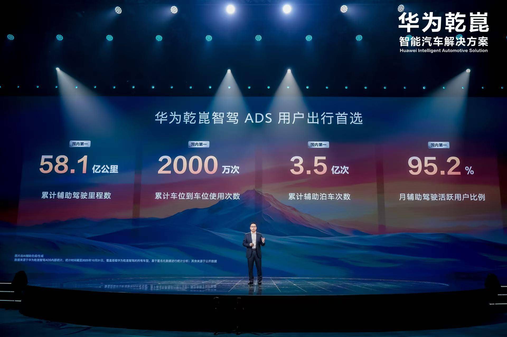 作为大会核心亮点,华为乾崑智驾技术再攀新峰。数据显示,截至2025年10月底,其累计辅助驾驶里程达58. 1亿公里,车位到车位使用次数超2000万次,辅助泊车次数3.5亿次,月活辅助驾驶活跃用户比例达95.2%,多项核心指标稳居国内第一。
