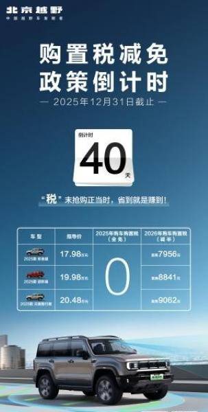 “税”末抢购正当时,省到就是赚到!一边是国家层面的免征购置税“末班车”,一边是北京越野诚意满满的厂补福利。在双重利好叠加下,当前无疑是入手北京越野的最佳时机。北京越野政策+企业的福利组合,也为消费者构建了一套完整的购车成本减负体系,从核心税费到购车补贴,全方位降低购车压力,让消费者感受到实实在在的诚意。