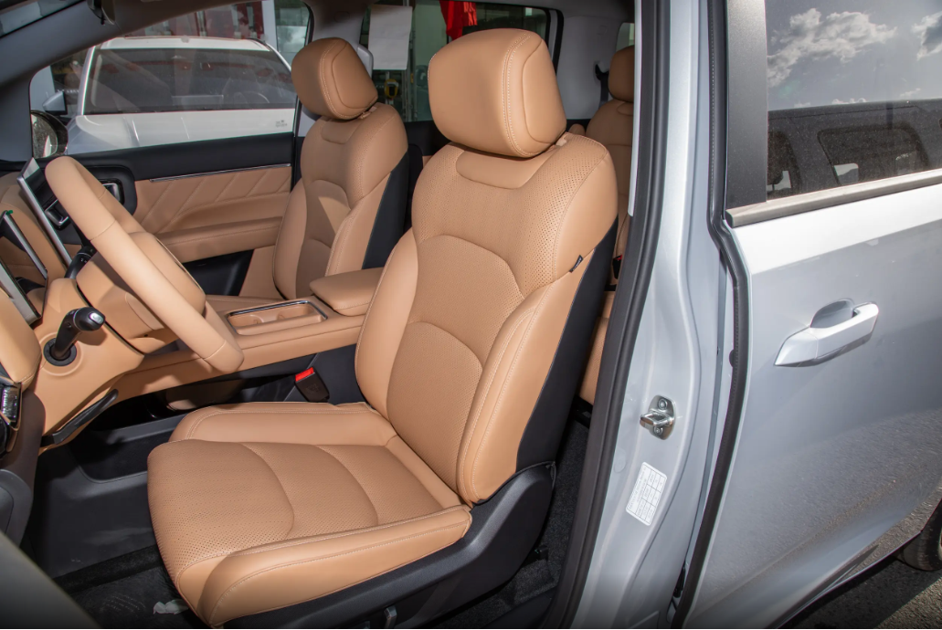 尺寸方面,新车的长宽高分别为4910/1850/1770mm,轴距为2910mm,这样的尺寸参数也保证了车内拥有宽敞的乘坐空间,2910mm的轴距和1850mm的车宽在同级车型中也具有不错的优势。我身高178cm(体重160斤),先坐进驾驶位试试。主驾座椅能6向电动调节,方向盘还能 4 向调,前后、高低、靠背角度都能拧到自己舒服的位置。我还特意让旁边180cm左右的销售顾问坐进去试了试,他说:“你别说,就算我这大高个,调好之后头部和腿部都有富余,一点不挤得慌。”接着我又挪到第二排,那独立航空座椅摸着就软乎乎的,皮质是 10mm 厚的复合皮,坐上去跟家里的沙发似的。