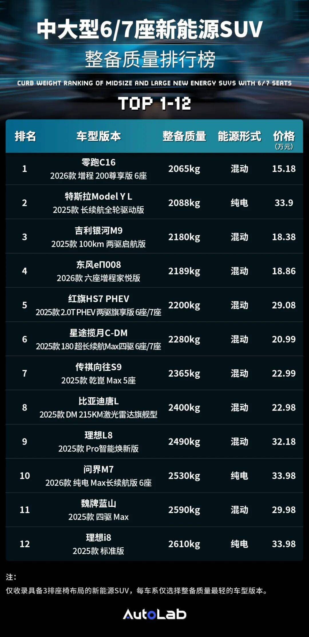 我们也整理了一份,中大型6/7座新能源SUV整备质量排行榜,如下: