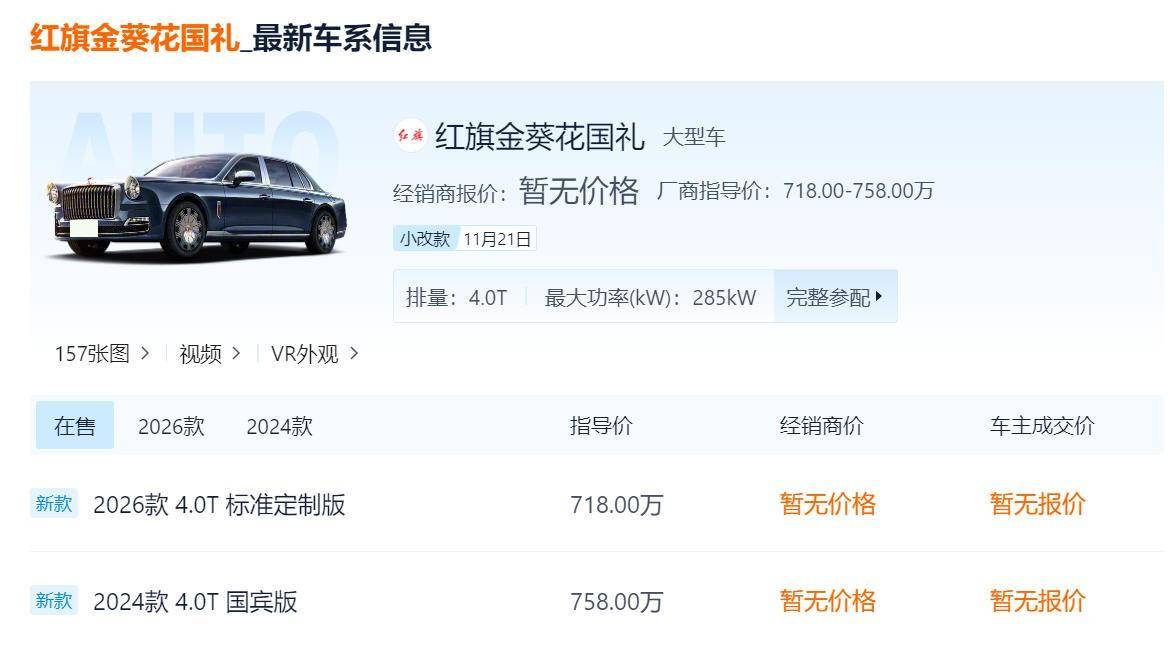是的,你没听错,红旗金葵花国礼“丹霞”主题定制版的售价就是718万,目前这款车已经全面开始接受订购,只是购买资格的话,反正像你我这样的普通人应该是买不到。