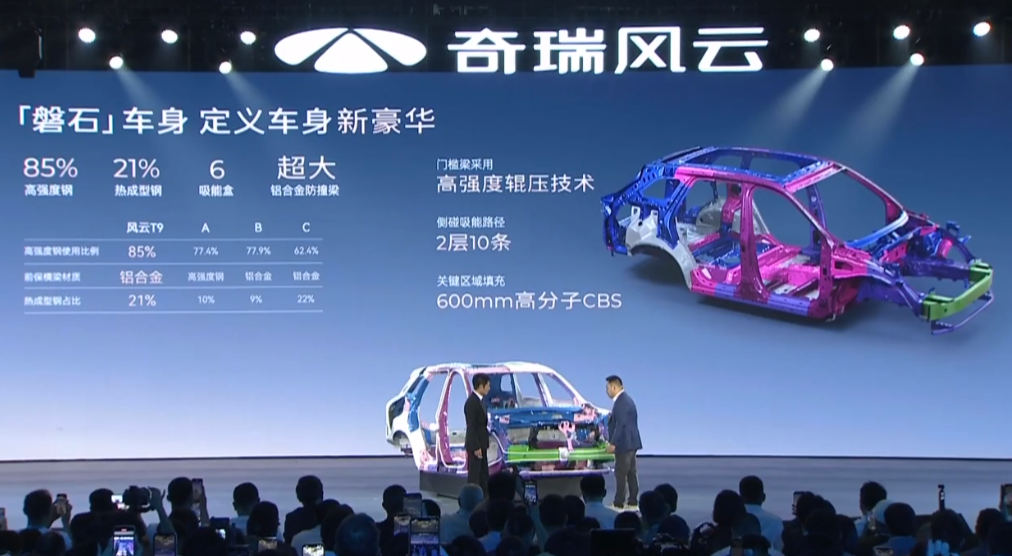 在汽车安全领域,车身结构是保护乘员的第一道防线,也是最后一道防线。风云T9 以“移动堡垒”为设计理念,采用85%高强度钢+21%热成型钢的车身架构,横向覆盖率85%的双防撞梁搭配6个吸能盒,形成全方位的结构防护网。这一数据远超同级平均水平,甚至媲美百万级豪车,央视主持人撒贝宁曾在工厂现场用冲击钻测试其白车身,坚硬程度可见一斑。