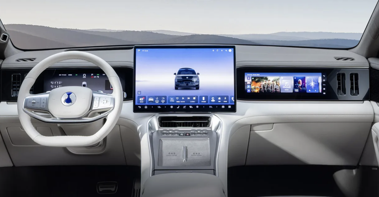 屏幕很多,17.3英寸的中控屏和后排娱屏,13.2英寸的液晶仪表和副驾娱乐屏,还有9英寸的流媒体后视镜以及50英寸的AR-HUD,挺有科技感。但副驾娱乐屏实在是太小,看视频两侧黑边严重,观感不好。