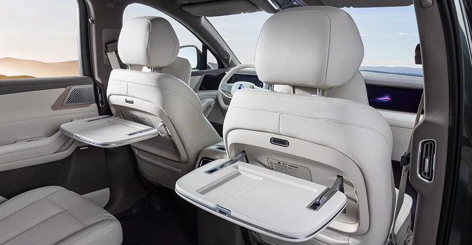 顶配给到了副驾零重力座椅,第二排右侧座椅配备腿托,所以如果都展开的话,前后座椅一定会打架的,这就看日常如何取舍了。但是后排两个小桌板确实很结实,而且设计不错,比较好用。